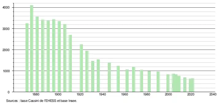 L'évolution du nombre d'habitants est connue à travers les recensements de la population effectués dans la commune depuis 1872. Pour les communes de moins de 10 000 habitants, une enquête de recensement portant sur toute la population est réalisée tous les cinq ans, les populations légales des années intermédiaires étant quant à elles estimées par interpolation ou extrapolation[24]. Pour la commune, le premier recensement exhaustif entrant dans le cadre du nouveau dispositif a été réalisé en 2004[25].