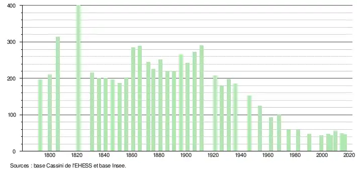 L'évolution du nombre d'habitants est connue à travers les recensements de la population effectués dans la commune depuis 1793. Pour les communes de moins de 10 000 habitants, une enquête de recensement portant sur toute la population est réalisée tous les cinq ans, les populations légales des années intermédiaires étant quant à elles estimées par interpolation ou extrapolation[5]. Pour la commune, le premier recensement exhaustif entrant dans le cadre du nouveau dispositif a été réalisé en 2004[6].