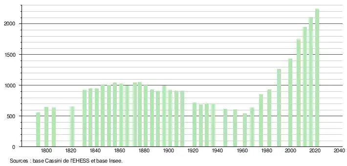 L'évolution du nombre d'habitants est connue à travers les recensements de la population effectués dans la commune depuis 1793. Pour les communes de moins de 10 000 habitants, une enquête de recensement portant sur toute la population est réalisée tous les cinq ans, les populations légales des années intermédiaires étant quant à elles estimées par interpolation ou extrapolation[22]. Pour la commune, le premier recensement exhaustif entrant dans le cadre du nouveau dispositif a été réalisé en 2006[23].