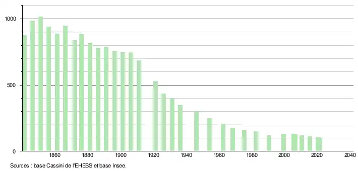 L'évolution du nombre d'habitants est connue à travers les recensements de la population effectués dans la commune depuis 1841. Pour les communes de moins de 10 000 habitants, une enquête de recensement portant sur toute la population est réalisée tous les cinq ans, les populations légales des années intermédiaires étant quant à elles estimées par interpolation ou extrapolation[18]. Pour la commune, le premier recensement exhaustif entrant dans le cadre du nouveau dispositif a été réalisé en 2005[19].