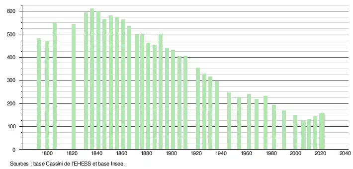 L'évolution du nombre d'habitants est connue à travers les recensements de la population effectués dans la commune depuis 1793. Pour les communes de moins de 10 000 habitants, une enquête de recensement portant sur toute la population est réalisée tous les cinq ans, les populations légales des années intermédiaires étant quant à elles estimées par interpolation ou extrapolation[15]. Pour la commune, le premier recensement exhaustif entrant dans le cadre du nouveau dispositif a été réalisé en 2005[16].