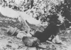 Alors nous sommes partis pour la maison. Quand nous nous sommes éloignés de l'école une cinquantaine de mètres, peut-être cent, jusqu'à la fontaine d'où l'on portait l'eau pour l'école et l'habitat autour, elle existe toujours, nous avons rencontré Lazo - les gendarmes l'emmènent. Une patrouille de gendarmes.
