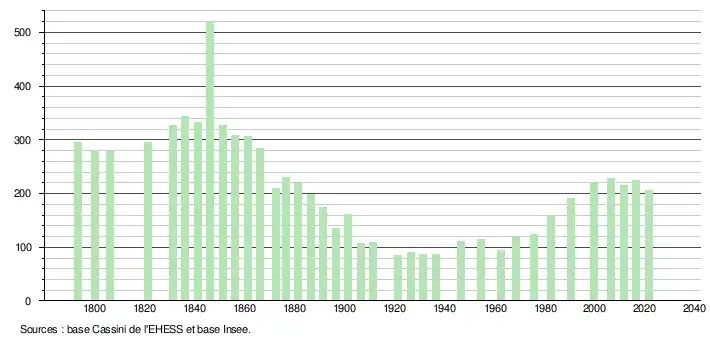 L'évolution du nombre d'habitants est connue à travers les recensements de la population effectués dans la commune depuis 1793. Pour les communes de moins de 10 000 habitants, une enquête de recensement portant sur toute la population est réalisée tous les cinq ans, les populations légales des années intermédiaires étant quant à elles estimées par interpolation ou extrapolation[20]. Pour la commune, le premier recensement exhaustif entrant dans le cadre du nouveau dispositif a été réalisé en 2006[21].