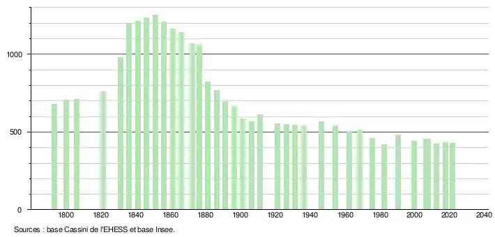 L'évolution du nombre d'habitants est connue à travers les recensements de la population effectués dans la commune depuis 1793. Pour les communes de moins de 10 000 habitants, une enquête de recensement portant sur toute la population est réalisée tous les cinq ans, les populations légales des années intermédiaires étant quant à elles estimées par interpolation ou extrapolation[25]. Pour la commune, le premier recensement exhaustif entrant dans le cadre du nouveau dispositif a été réalisé en 2007[26].