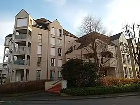 - Le bâtiment d'habitation proche de la place de la Commune construit par l'architecte Martin Schulz van Treeck en 1976.