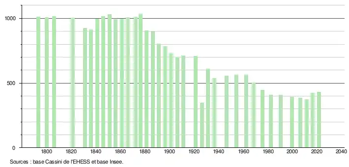 L'évolution du nombre d'habitants est connue à travers les recensements de la population effectués dans la commune depuis 1793. Pour les communes de moins de 10 000 habitants, une enquête de recensement portant sur toute la population est réalisée tous les cinq ans, les populations légales des années intermédiaires étant quant à elles estimées par interpolation ou extrapolation[17]. Pour la commune, le premier recensement exhaustif entrant dans le cadre du nouveau dispositif a été réalisé en 2006[18].