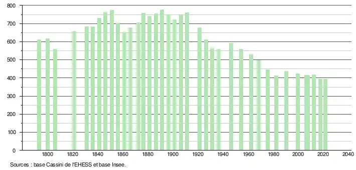 L'évolution du nombre d'habitants est connue à travers les recensements de la population effectués dans la commune depuis 1793. Pour les communes de moins de 10 000 habitants, une enquête de recensement portant sur toute la population est réalisée tous les cinq ans, les populations légales des années intermédiaires étant quant à elles estimées par interpolation ou extrapolation[23]. Pour la commune, le premier recensement exhaustif entrant dans le cadre du nouveau dispositif a été réalisé en 2007[24].