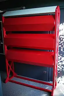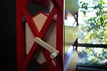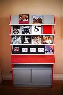 En outre, l'ensemble comprenait deux présentoirs à livres munies de cinq étagères inclinées, sans vitrage, et de tiroirs sur le niveau inférieur, qui pouvaient être convertis en petites tables ou en caissons. Un autre élément de l'intérieur était un présentoir d'une conception spécifique : ses trois tambours rotatifs horizontaux permettaient d'exposer alternativement différents contenus visuels[4],[1].