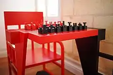 La deuxième table du set était la table d'échecs. Rodtchenko considérait les échecs comme un élément indispensable du passe-temps culturel du prolétariat, contribuant à son développement intellectuel. L’échiquier pouvait être tourné horizontalement pour changer la couleur attribuée au joueur au début d'une nouvelle partie, sans que les joueurs n’aient à se lever de table. Les deux chaises destinées aux joueurs d'échecs munies d'accoudoirs et de dossiers rectangulaires, constitués de quatre planches verticales parallèles et d'une traverse supérieure horizontale. Les pieds rectangulaires, sur lesquels elles étaient montées, s'emboitaient sous le plateau d'échiquier, exactement en son milieu[8],[4],[1].