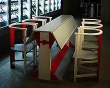 Ce dispositif multifonctionnel a été conçu pour être placé contre un mur de la pièce, tandis que deux tables occupaient le centre de l'ensemble. L'une d'entre elles, une longue table pour les réunions, l'écriture et la lecture, était garnie de douze chaises sans accoudoirs avec des dossiers haut dont les traverses supérieures étaient de forme semi-circulaire. La table était composée de deux sections et pouvait être divisée en deux tables plus petites, pouvant accueillir six personnes chacune. En outre, le plateau pliant permettait de doubler ou de tripler instantanément la taille de la table[8],[4],[1].