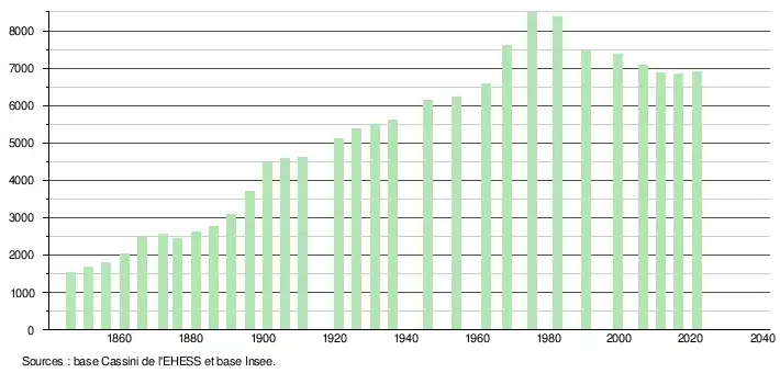 L'évolution du nombre d'habitants est connue à travers les recensements de la population effectués dans la commune depuis 1846. Pour les communes de moins de 10 000 habitants, une enquête de recensement portant sur toute la population est réalisée tous les cinq ans, les populations légales des années intermédiaires étant quant à elles estimées par interpolation ou extrapolation[23]. Pour la commune, le premier recensement exhaustif entrant dans le cadre du nouveau dispositif a été réalisé en 2006[24].