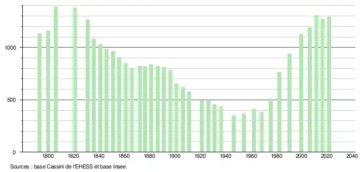 L'évolution du nombre d'habitants est connue à travers les recensements de la population effectués dans la commune depuis 1793. Pour les communes de moins de 10 000 habitants, une enquête de recensement portant sur toute la population est réalisée tous les cinq ans, les populations légales des années intermédiaires étant quant à elles estimées par interpolation ou extrapolation[37]. Pour la commune, le premier recensement exhaustif entrant dans le cadre du nouveau dispositif a été réalisé en 2006[38].