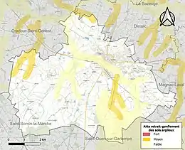 Le retrait-gonflement des sols argileux est susceptible d'engendrer des dommages importants aux bâtiments en cas d’alternance de périodes de sécheresse et de pluie[11]. 6,5 % de la superficie communale est en aléa moyen ou fort (27 % au niveau départemental et 48,5 % au niveau national métropolitain)[Carte 2]. Depuis le , en application de la loi ÉLAN, différentes contraintes s'imposent aux vendeurs, maîtres d'ouvrages ou constructeurs de biens situés dans une zone classée en aléa moyen ou fort[Note 2],[12].