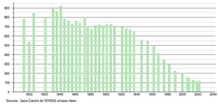 L'évolution du nombre d'habitants est connue à travers les recensements de la population effectués dans la commune depuis 1793. Pour les communes de moins de 10 000 habitants, une enquête de recensement portant sur toute la population est réalisée tous les cinq ans, les populations légales des années intermédiaires étant quant à elles estimées par interpolation ou extrapolation[14]. Pour la commune, le premier recensement exhaustif entrant dans le cadre du nouveau dispositif a été réalisé en 2008[15].
