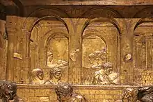 L'espace n'est pas fini, mais semble plutôt s'étendre au-delà du relief, comme le montrent les arches ou les silhouettes coupées en deux. Même l'arrière-plan ne semble être qu'une partie de quelque chose de plus grand. L'espace de la Renaissance, fini et mesurable, qui est ici présent grâce au sol régulier, laisse ainsi la place à un espace indéfini, typique de la peinture flamande.