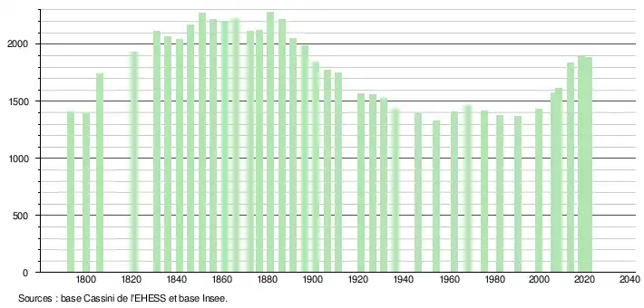 L'évolution du nombre d'habitants est connue à travers les recensements de la population effectués dans la commune depuis 1793. Pour les communes de moins de 10 000 habitants, une enquête de recensement portant sur toute la population est réalisée tous les cinq ans, les populations légales des années intermédiaires étant quant à elles estimées par interpolation ou extrapolation[27]. Pour la commune, le premier recensement exhaustif entrant dans le cadre du nouveau dispositif a été réalisé en 2008[28].