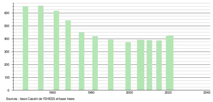 Le nombre d'exploitations agricoles en activité et ayant leur siège dans la commune est passé de 55 lors du recensement agricole de 1988[Note 13] à 37 en 2000 puis à 28 en 2010[35] et enfin à 24 en 2020[Carte 6], soit une baisse de 56 % en 32 ans. Le même mouvement est observé à l'échelle du département qui a perdu pendant cette période 58 % de ses exploitations[36],[Carte 7]. La surface agricole utilisée sur la commune a également diminué, passant de 1743 ha en 1988 à 1725 ha en 2020[Carte 8]. Parallèlement la surface agricole utilisée moyenne par exploitation a augmenté, passant de 32 à 72 ha[35].