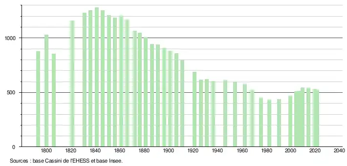 L'évolution du nombre d'habitants est connue à travers les recensements de la population effectués dans la commune depuis 1793. Pour les communes de moins de 10 000 habitants, une enquête de recensement portant sur toute la population est réalisée tous les cinq ans, les populations légales des années intermédiaires étant quant à elles estimées par interpolation ou extrapolation[17]. Pour la commune, le premier recensement exhaustif entrant dans le cadre du nouveau dispositif a été réalisé en 2004[18].