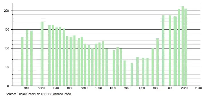 L'évolution du nombre d'habitants est connue à travers les recensements de la population effectués dans la commune depuis 1793. Pour les communes de moins de 10 000 habitants, une enquête de recensement portant sur toute la population est réalisée tous les cinq ans, les populations légales des années intermédiaires étant quant à elles estimées par interpolation ou extrapolation[21]. Pour la commune, le premier recensement exhaustif entrant dans le cadre du nouveau dispositif a été réalisé en 2007[22].