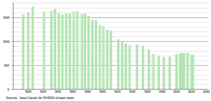 L'évolution du nombre d'habitants est connue à travers les recensements de la population effectués dans la commune depuis 1793. Pour les communes de moins de 10 000 habitants, une enquête de recensement portant sur toute la population est réalisée tous les cinq ans, les populations légales des années intermédiaires étant quant à elles estimées par interpolation ou extrapolation[21]. Pour la commune, le premier recensement exhaustif entrant dans le cadre du nouveau dispositif a été réalisé en 2004[22].