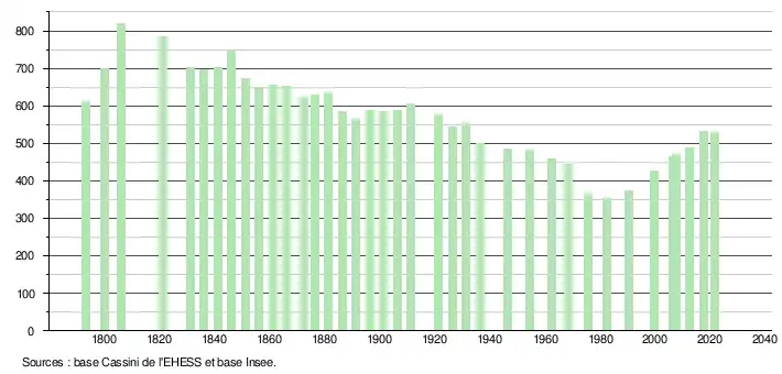 L'évolution du nombre d'habitants est connue à travers les recensements de la population effectués dans la commune depuis 1793. Pour les communes de moins de 10 000 habitants, une enquête de recensement portant sur toute la population est réalisée tous les cinq ans, les populations légales des années intermédiaires étant quant à elles estimées par interpolation ou extrapolation[45]. Pour la commune, le premier recensement exhaustif entrant dans le cadre du nouveau dispositif a été réalisé en 2007[46].
