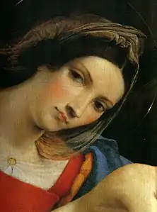Malgré la mutilation, l’œuvre demeure l’une des plus significatives du séjour de l’artiste à Bergame, riche en inventions iconographiques et en couleurs vives et corsées, avec des effets d’une grande préciosité. Le décor domestique y est luxueux, comme en témoignent le tapis oriental sur le rebord de la fenêtre et la chaise avec le corami (cuir décoré) et les boutons.
