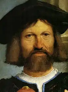 Un ange et le commanditaire Bonghi assistent à la scène, dont Lotto a réalisé un portrait frontal pénétrant, avec un usage expressif des mains. C’est un hommage de l’artiste à l’homme afin de personnaliser et embellir l’œuvre, et non un autoportrait du Lotto lui-même, comme il fut longtemps supposé.