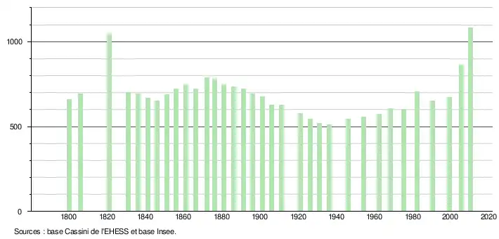 L'évolution du nombre d'habitants est connue à travers les recensements de la population effectués dans la commune depuis 1800. À partir du , les populations légales des communes sont publiées annuellement dans le cadre d'un recensement qui repose désormais sur une collecte d'information annuelle, concernant successivement tous les territoires communaux au cours d'une période de cinq ans. Pour les communes de moins de 10 000 habitants, une enquête de recensement portant sur toute la population est réalisée tous les cinq ans, les populations légales des années intermédiaires étant quant à elles estimées par interpolation ou extrapolation[9]. Pour la commune, le premier recensement exhaustif entrant dans le cadre du nouveau dispositif a été réalisé en 2005[10],[Note 1].