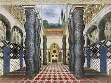 Léon Bakst cherche une pureté des lignes, un tableau vivant et coloré. Pour cela le décorateur met au point un système de poulies et de panneaux disposés de manière verticale et parallèle qui avancent et reculent au fil des différents actes. Il utilise ainsi la perspective, la lumière et le mouvement. Léon Bakst est un visionnaire et cherche un décor toujours plus fusionnel avec la musique, la danse et la lumière. Il s’agit de mettre en scène un Moyen-Âge idéal, pour cela Léon Bakst utilise plusieurs symboles, il décline le symbole de la croix (du crucifix) dans le décor ainsi que dans les costumes, symbole qui convient parfaitement dans sa quête de pureté et de forme linéaire. L’artiste dira à Gabriele d’Annunzio à propos du décor de la Pisanelle (joué pour la première fois en à théâtre du Châtelet à Paris) : « Je cherche et j’ai toujours cherché dans la décoration l’expression la plus intense du sentiment de la pièce, que j’entoure d’une ambiance conforme ; j’aime la passion des couleurs, comme dans la forme, j’adore les belles étoffes, l’or, les diamants et je suis poussé par un désir ardent de rassembler les plus violents contrastes pour obtenir l’impression d’une richesse et d’une passion affolante ! Voilà les éléments que j’adore : la couleur impériale, la belle et sensuelle forme, le sang, l’odeur de la transpiration, la voix étranglée par l’émotion, les spectacles d’émotions profondes, angoissantes et l’orgueil et la belle chair, saine et splendide »[5].