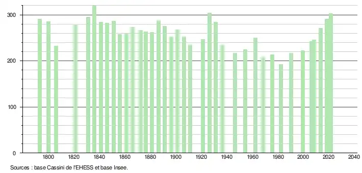 L'évolution du nombre d'habitants est connue à travers les recensements de la population effectués dans la commune depuis 1793. Pour les communes de moins de 10 000 habitants, une enquête de recensement portant sur toute la population est réalisée tous les cinq ans, les populations légales des années intermédiaires étant quant à elles estimées par interpolation ou extrapolation[16]. Pour la commune, le premier recensement exhaustif entrant dans le cadre du nouveau dispositif a été réalisé en 2008[17].