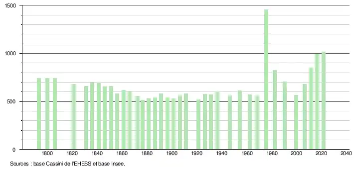 L'évolution du nombre d'habitants est connue à travers les recensements de la population effectués dans la commune depuis 1793. Pour les communes de moins de 10 000 habitants, une enquête de recensement portant sur toute la population est réalisée tous les cinq ans, les populations légales des années intermédiaires étant quant à elles estimées par interpolation ou extrapolation[43]. Pour la commune, le premier recensement exhaustif entrant dans le cadre du nouveau dispositif a été réalisé en 2006[44].