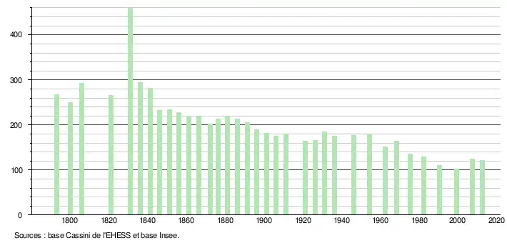 L'évolution du nombre d'habitants est connue à travers les recensements de la population effectués dans la commune depuis 1793. À partir du , les populations légales des communes sont publiées annuellement dans le cadre d'un recensement qui repose désormais sur une collecte d'information annuelle, concernant successivement tous les territoires communaux au cours d'une période de cinq ans. Pour les communes de moins de 10 000 habitants, une enquête de recensement portant sur toute la population est réalisée tous les cinq ans, les populations légales des années intermédiaires étant quant à elles estimées par interpolation ou extrapolation[9]. Pour la commune, le premier recensement exhaustif entrant dans le cadre du nouveau dispositif a été réalisé en 2007[10],[Note 2].