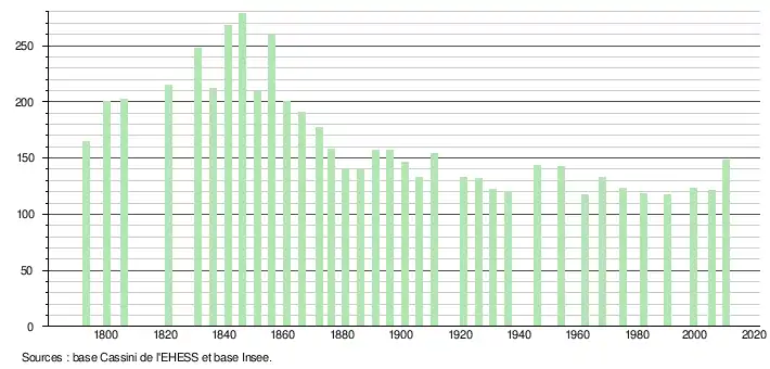 - Dans le tableau des recensements et le graphique, par convention dans Wikipédia, le principe a été retenu, pour les populations légales postérieures à 1999 de n’afficher dans le tableau des recensements et le graphique que les populations correspondant à l'année 2006, première population légale publiée calculée conformément aux concepts définis dans le décret no 2003-485 du 5 juin 2003, et les années correspondant à une enquête exhaustive de recensement pour les communes de moins de 10 000 habitants, ainsi que la dernière population légale publiée par l’Insee.