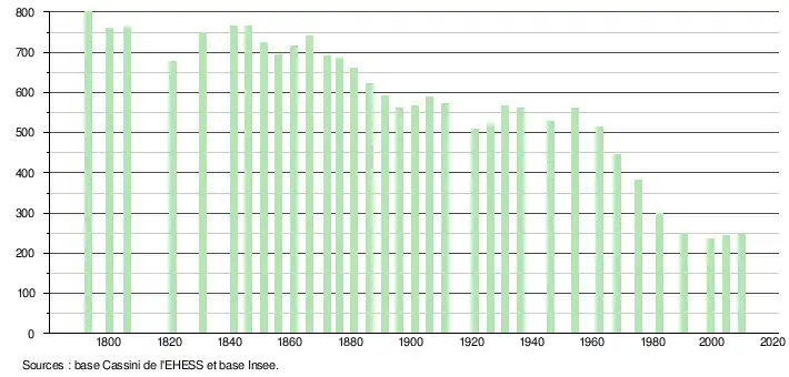 L'évolution du nombre d'habitants est connue à travers les recensements de la population effectués dans la commune depuis 1793. À partir du , les populations légales des communes sont publiées annuellement dans le cadre d'un recensement qui repose désormais sur une collecte d'information annuelle, concernant successivement tous les territoires communaux au cours d'une période de cinq ans. Pour les communes de moins de 10 000 habitants, une enquête de recensement portant sur toute la population est réalisée tous les cinq ans, les populations légales des années intermédiaires étant quant à elles estimées par interpolation ou extrapolation[5]. Pour la commune, le premier recensement exhaustif entrant dans le cadre du nouveau dispositif a été réalisé en 2004[6],[Note 2].