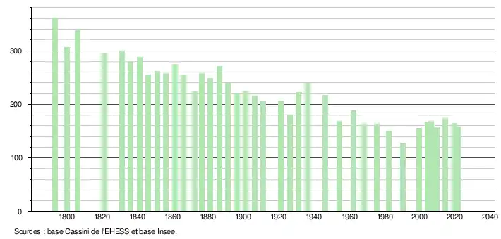 L'évolution du nombre d'habitants est connue à travers les recensements de la population effectués dans la commune depuis 1793. Pour les communes de moins de 10 000 habitants, une enquête de recensement portant sur toute la population est réalisée tous les cinq ans, les populations légales des années intermédiaires étant quant à elles estimées par interpolation ou extrapolation[24]. Pour la commune, le premier recensement exhaustif entrant dans le cadre du nouveau dispositif a été réalisé en 2004[25].