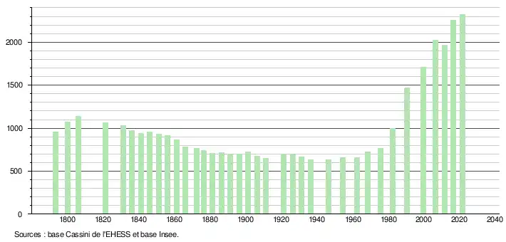 L'évolution du nombre d'habitants est connue à travers les recensements de la population effectués dans la commune depuis 1793. Pour les communes de moins de 10 000 habitants, une enquête de recensement portant sur toute la population est réalisée tous les cinq ans, les populations légales des années intermédiaires étant quant à elles estimées par interpolation ou extrapolation[27]. Pour la commune, le premier recensement exhaustif entrant dans le cadre du nouveau dispositif a été réalisé en 2006[28].