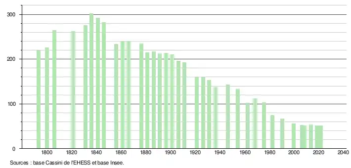 L'évolution du nombre d'habitants est connue à travers les recensements de la population effectués dans la commune depuis 1793. Pour les communes de moins de 10 000 habitants, une enquête de recensement portant sur toute la population est réalisée tous les cinq ans, les populations légales des années intermédiaires étant quant à elles estimées par interpolation ou extrapolation[15]. Pour la commune, le premier recensement exhaustif entrant dans le cadre du nouveau dispositif a été réalisé en 2008[16].