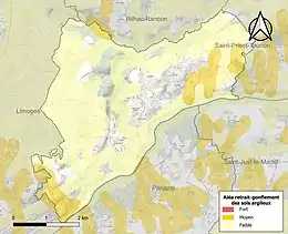 Le retrait-gonflement des sols argileux est susceptible d'engendrer des dommages importants aux bâtiments en cas d’alternance de périodes de sécheresse et de pluie[23]. 11,2 % de la superficie communale est en aléa moyen ou fort (27 % au niveau départemental et 48,5 % au niveau national métropolitain)[Carte 2]. Depuis le , en application de la loi ÉLAN, différentes contraintes s'imposent aux vendeurs, maîtres d'ouvrages ou constructeurs de biens situés dans une zone classée en aléa moyen ou fort[Note 4],[24].