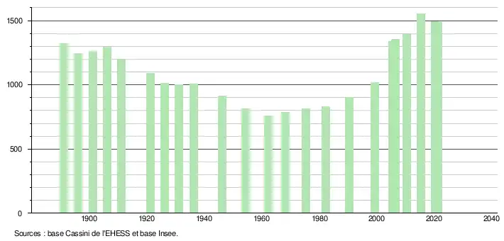 L'évolution du nombre d'habitants est connue à travers les recensements de la population effectués dans la commune depuis 1891. Pour les communes de moins de 10 000 habitants, une enquête de recensement portant sur toute la population est réalisée tous les cinq ans, les populations légales des années intermédiaires étant quant à elles estimées par interpolation ou extrapolation[18]. Pour la commune, le premier recensement exhaustif entrant dans le cadre du nouveau dispositif a été réalisé en 2005[19].