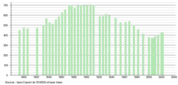 L'évolution du nombre d'habitants est connue à travers les recensements de la population effectués dans la commune depuis 1793. Pour les communes de moins de 10 000 habitants, une enquête de recensement portant sur toute la population est réalisée tous les cinq ans, les populations légales des années intermédiaires étant quant à elles estimées par interpolation ou extrapolation[19]. Pour la commune, le premier recensement exhaustif entrant dans le cadre du nouveau dispositif a été réalisé en 2004[20].