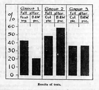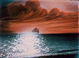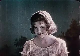 Alors que dans les premiers temps du cinéma la couleur était considérée comme une attraction, Fairbanks craint qu'elle ne soit plutôt une distraction, présentant, outre le risque de fatiguer le public, celui « d'enlever toute attention au jeu et à l'expression faciale, en tachant et en embrouillant l'action »[106]. Cette crainte met en lumière le statut paradoxal de la couleur dans le cinéma muet : alors qu'elle est censée avoir un rôle indiciel en créant une illusion de réalité[107], elle a plutôt une fonction sensuelle, spectaculaire et métaphorique[108] voire ornementale[109], celle d'une attraction destinée à exercer sur le spectateur « une action sensorielle ou psychologique »[110],[111]. Fairbanks évoque ce qu'il appelle des « doutes conventionnels » à propos de la couleur, en particulier l'idée qu'elle « militerait contre la simplicité et l'action directe » du noir et blanc[106]. Il se réfère notamment au point de vue de Cecil B. DeMille selon lequel la couleur doit être discrète pour ne pas gêner la narration[112] : « l'œil du spectateur ne peut supporter une trop grande tension et la variété des couleurs distrairait l'attention de l'histoire »[113] Cette opposition remonte notamment au conflit commercial dans les années 1900-1910 entre les films coloriés au stencil de Pathé et ceux en noir et blanc de ses concurrents américains[114], dans le contexte d'évolutions culturelles spécifiquement américaines, tels l'essor de la similigravure aux dépens de la chromolithographie[115] ou celui d'une esthétique « viriliste » de l'authenticité au détriment d'une dilection prétendument féminine pour l'imitation[116]. Cette évolution se traduit par une vogue du jeu vraisemblable par opposition à celui « histrionique »[117], mais aussi, parallèlement au développent du noir et blanc orthochromatique, à celui du recours à un teintage et un virage plus doux et plus délicats, ne distrayant pas de la narration, où la coloration apporte un réalisme psychologique plutôt qu'optique, fondé sur une réflexion sur l'effet psychologique de la couleur, non plus en dominant l'image mais de manière discrète[118],[N 12].