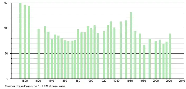 L'évolution du nombre d'habitants est connue à travers les recensements de la population effectués dans la commune depuis 1793. Pour les communes de moins de 10 000 habitants, une enquête de recensement portant sur toute la population est réalisée tous les cinq ans, les populations légales des années intermédiaires étant quant à elles estimées par interpolation ou extrapolation[25]. Pour la commune, le premier recensement exhaustif entrant dans le cadre du nouveau dispositif a été réalisé en 2006[26].