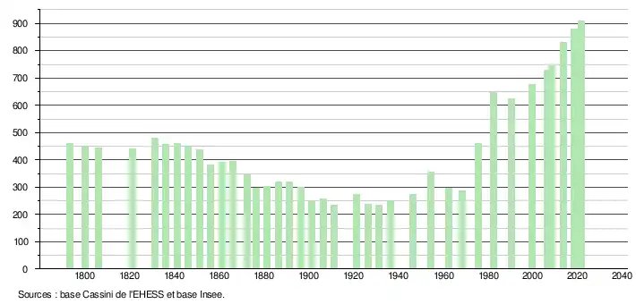 L'évolution du nombre d'habitants est connue à travers les recensements de la population effectués dans la commune depuis 1793. Pour les communes de moins de 10 000 habitants, une enquête de recensement portant sur toute la population est réalisée tous les cinq ans, les populations légales des années intermédiaires étant quant à elles estimées par interpolation ou extrapolation[8]. Pour la commune, le premier recensement exhaustif entrant dans le cadre du nouveau dispositif a été réalisé en 2008[9].
