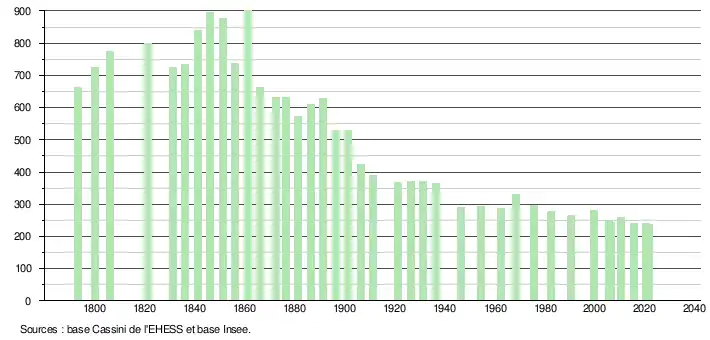 L'évolution du nombre d'habitants est connue à travers les recensements de la population effectués dans la commune depuis 1793. Pour les communes de moins de 10 000 habitants, une enquête de recensement portant sur toute la population est réalisée tous les cinq ans, les populations légales des années intermédiaires étant quant à elles estimées par interpolation ou extrapolation[27]. Pour la commune, le premier recensement exhaustif entrant dans le cadre du nouveau dispositif a été réalisé en 2005[28].