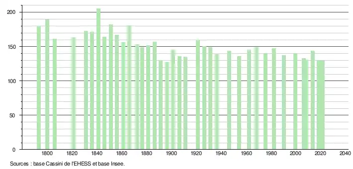 L'évolution du nombre d'habitants est connue à travers les recensements de la population effectués dans la commune depuis 1793. Pour les communes de moins de 10 000 habitants, une enquête de recensement portant sur toute la population est réalisée tous les cinq ans, les populations légales des années intermédiaires étant quant à elles estimées par interpolation ou extrapolation[27]. Pour la commune, le premier recensement exhaustif entrant dans le cadre du nouveau dispositif a été réalisé en 2008[28].