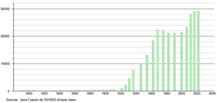 - Par convention dans Wikipédia, le principe a été retenu de n’afficher dans le tableau des recensements et le graphique, pour les populations légales postérieures à 1999, que les populations correspondant à une enquête exhaustive de recensement pour les communes de moins de 10 000 habitants, et que les populations des années 2006, 2011, 2016, etc. pour les communes de plus de 10 000 habitants, ainsi que la dernière population légale publiée par l’Insee pour l'ensemble des communes.