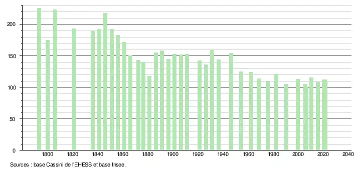 L'évolution du nombre d'habitants est connue à travers les recensements de la population effectués dans la commune depuis 1793. Pour les communes de moins de 10 000 habitants, une enquête de recensement portant sur toute la population est réalisée tous les cinq ans, les populations légales des années intermédiaires étant quant à elles estimées par interpolation ou extrapolation[18]. Pour la commune, le premier recensement exhaustif entrant dans le cadre du nouveau dispositif a été réalisé en 2005[19].