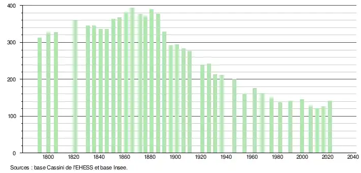 L'évolution du nombre d'habitants est connue à travers les recensements de la population effectués dans la commune depuis 1793. Pour les communes de moins de 10 000 habitants, une enquête de recensement portant sur toute la population est réalisée tous les cinq ans, les populations légales des années intermédiaires étant quant à elles estimées par interpolation ou extrapolation[17]. Pour la commune, le premier recensement exhaustif entrant dans le cadre du nouveau dispositif a été réalisé en 2006[18].
