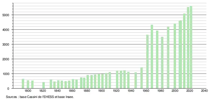 L'évolution du nombre d'habitants est connue à travers les recensements de la population effectués dans la commune depuis 1793. Pour les communes de moins de 10 000 habitants, une enquête de recensement portant sur toute la population est réalisée tous les cinq ans, les populations légales des années intermédiaires étant quant à elles estimées par interpolation ou extrapolation[25]. Pour la commune, le premier recensement exhaustif entrant dans le cadre du nouveau dispositif a été réalisé en 2007[26].