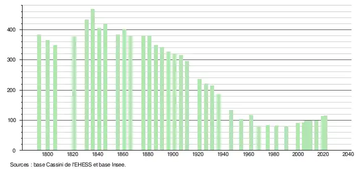 L'évolution du nombre d'habitants est connue à travers les recensements de la population effectués dans la commune depuis 1793. Pour les communes de moins de 10 000 habitants, une enquête de recensement portant sur toute la population est réalisée tous les cinq ans, les populations légales des années intermédiaires étant quant à elles estimées par interpolation ou extrapolation[22]. Pour la commune, le premier recensement exhaustif entrant dans le cadre du nouveau dispositif a été réalisé en 2004[23].